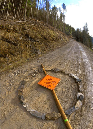 Zero Log Trucks Circle. At the beginning of a logging road leading high up into the Coeur d'Alene Watershed an activist found this sign on the ground and using it as a slash across the circle of rocks, made the obvious point. The Coeur d'Alene may be the most heavily roaded forest watershed of all National Forests in the country. Road densities in this region reach an average of 10.85 linear road miles per square mile, and in some places as high 20 linear miles per square mile.