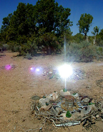 " I used materials found on site, showing our human influence on the this National Forest. As I was collecting the broken beer bottles, mirror pieces, empty gun shells and target cans I thought that these people probably were just trying to have "a good time in nature". After creating the zerocircles, I walked around in the area and picked up the trash. I realized, sad and frustrated that it would be impossible for me to pick up all the scattered shards of glass and trash I saw all over the place. It felt like a microcosm or reflection of what we as a human race are doing to our Mother Earth: The results of this "good time in nature" would be nearly permanent, difficult to reverse, possibly leading to injury of animals or humans or even wild fire. But how can we PROTECT our National Forests from ourselves? There are organizations who deal with clear cutting and overgrazing but the consciousness and responsibility about our actions individually lies within each of us. I am asking the universe to help each one of us to stay connected or to reconnect with this core within us."