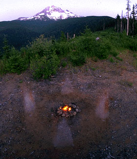 Ghost Dance Circle. On the log deck of a ten-year-old clearcut, Prescott University Dancer Professor, Liz Fallor dances around a fire ring, pausing at each of the four directions to welcome the slowly recovering forest. With the old forest missing, Mt. Hood looms in the background, a beautiful view yes....but not the one nature intended here.
