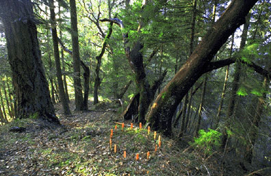 Lou Gold's Bald Mt.Wheel.The contemporary on-the-ground forest activist movement began in 1983 when Earth First! and local activists from southern Oregon planted themselves in front of the bulldozers on the Bald Mountain road in the Siskiyou National Forest. Following that seminal controversy, Lou Gold hiked back into the North Kalmiopsis wilderness to begin twelve consecutive seasons of summer-long vigils where he becameme the caretaker of the the prayer circle on Bald Montain. At the end of his second season on the mountain, he wrote: