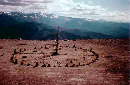 "By Solstice, the Medicine Wheel had been fully restored. Brightly colored flags waved in the strong breeze and fresh strings of tobacco ties decorated the flagpoles. On Solstice we spent twenty-four hours within the prayer circle, fasting and remaining in silence. The night before, we had gone to sleep blanketed by wet clouds that hovered about the mountaintop. At dawn a patch of blue sky opened directly above us. All day we watched as the sun burned off the moisture, and mountain ridges rose out of the low-lying fog and the clear sky spread toward the coast. It felt as if a light or energy was radiating outward from Bald Mountain."